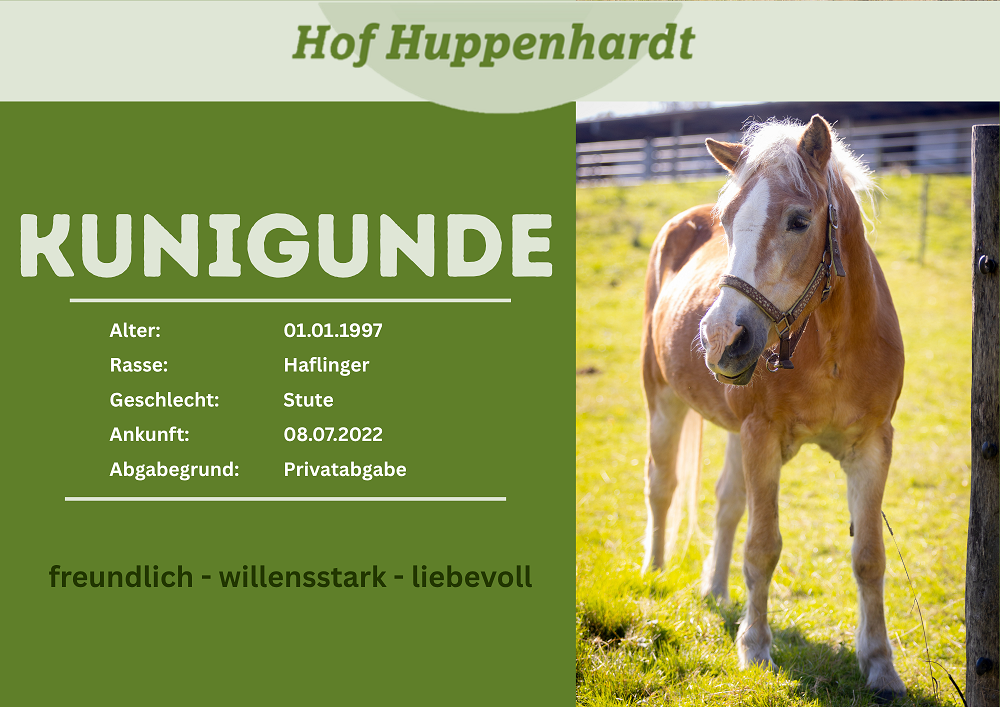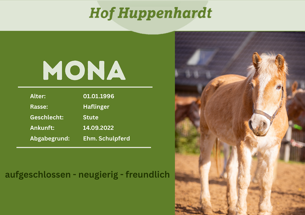 Die hübsche Haflinger-Stute war viele Jahre als Schulpferd im Einsatz. Als ihr Dienst in der Reitschule altersbedingt beendet wurde, verkaufte man die Stute als Freizeitpferd. Aus ihrem neuen Zuhause kam Mona jedoch leider zu der Reitschule zurück, da sie mit der neuen Herde nicht gut zurechtkam. Aufgrund einer Lahmheit, deren Ursprung nicht geklärt werden konnte, musste sie einige Wochen medizinisch behandelt werden, bis sie bei uns einziehen konnte. Wir konnten herausfinden, dass das Lahmheits-Problem durch eine Arthrose in den vorderen Beinen und eine Verknöcherung der Wirbelsäule hervorgerufen wird. Mona zeigt sich sehr freundlich und aufgeschlossen im Umgang.Steckbrief