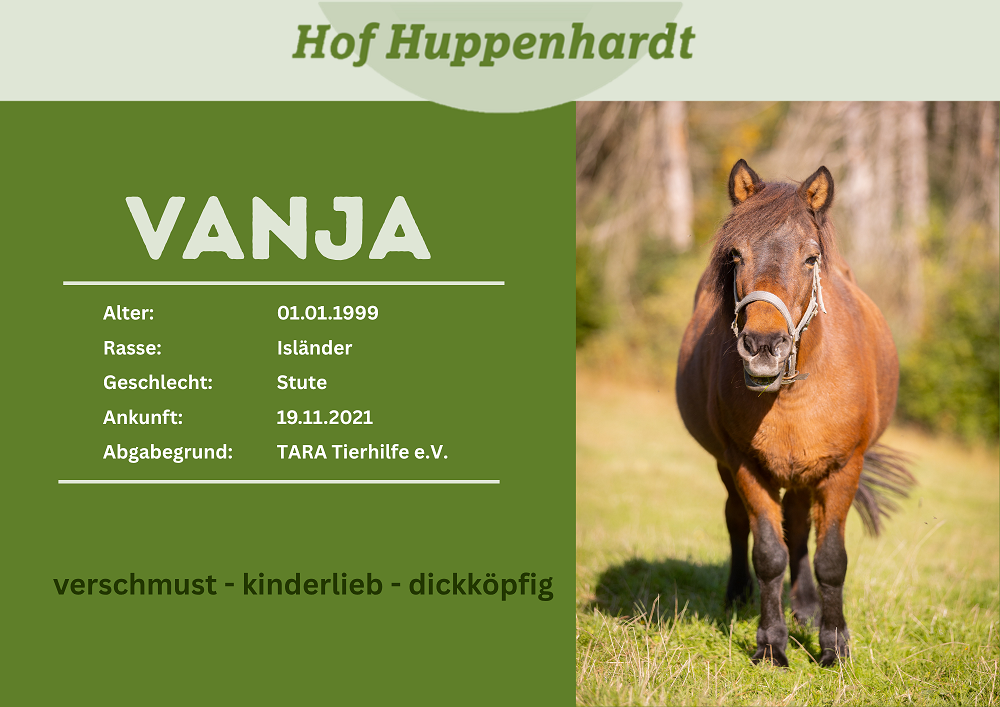Vanja haben wir von der Tara Tierhilfe übernommen. Die ehemalige Zuchtstute darf auf Hof Huppenhardt ihr Leben in Offenstallhaltung mit großer Weide genießen wie es sich für ihre Rasse gehört. Die liebenswerte Isländerstute zieht es unter Umständen vor, Menschen gegenüber ihren eigenen Kopf durchzusetzen. Ihren Artgenossen zeigt sie gerne wer die Stute im Stall ist und klärt bei wenig Platzangebot gerne ihren Rangposten ab. Wir haben Vanja bisher als verschmustes Pferd kennengelernt welches den Menschen gegenüber freundlich und aufgeschlossen gegenüber tritt.Steckbrief