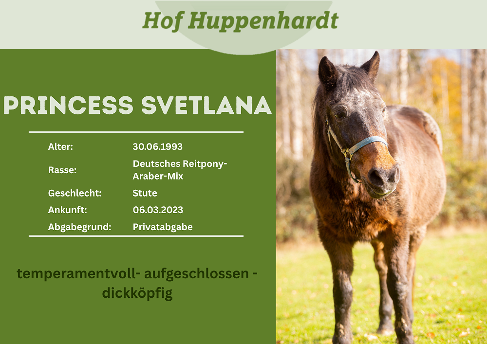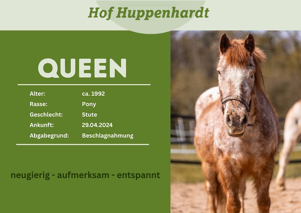 Letty kam gemeinsam mit Romina, die mittlerweile vermittelt wurde, nach Hof Huppenhardt. Beide stammen aus einer tierquälerischen Haltung, die vom Veterinäramt aufgelöst wurde. Während für einige Pferde jede Hilfe zu spät kam, hatte Letty Glück und sucht nun ein neues Zuhause bei verantwortungsvollen Menschen. Die süße Ponystute freut sich immer sehr über Spaziergänge und leichte Bodenarbeit. Letty ist an Cushing erkrankt und hat Hufrehe. Sie lebt deshalb zurzeit gemeinsam mit Flöckchen in unserer Hufrehe-Herde.Steckbrief