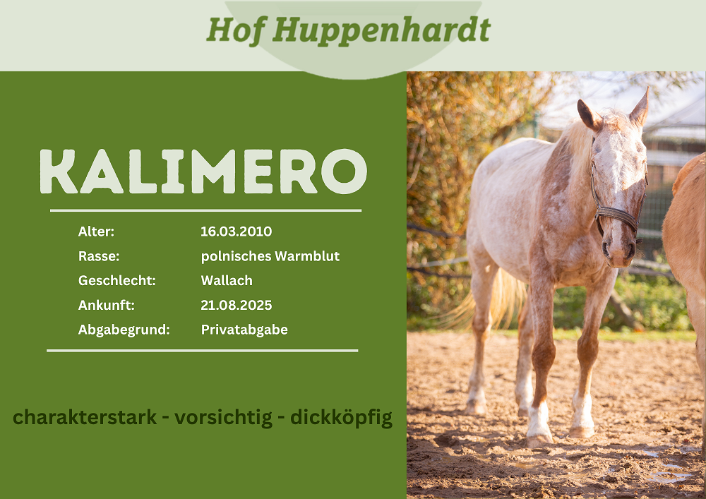 Kalimero kam zusammen mit seiner Begleitstute Merry über den Bliesheimer Gnadenhof zu uns. Die engagierten Tierschützenden des Gnadenhofes ereilte der dringende Hilferuf einer privaten Halterin, die erkrankt ist und sich deswegen nicht mehr um die zwei kümmern kann. Da der Gnadenhof selbst nicht die Möglichkeit hat, den besonderen Bedürfnissen des Wallachs gerecht zu werden, haben sie sich an uns gewandt. Kalimero ist erblindet und benötigt dringend eine Augen-Operation. Wir kümmern uns gerade um seine medizinische Versorgung. Bald soll er dann zusammen mit Merry in unsere andere Blinden-Herde integriert werden.Steckbrief