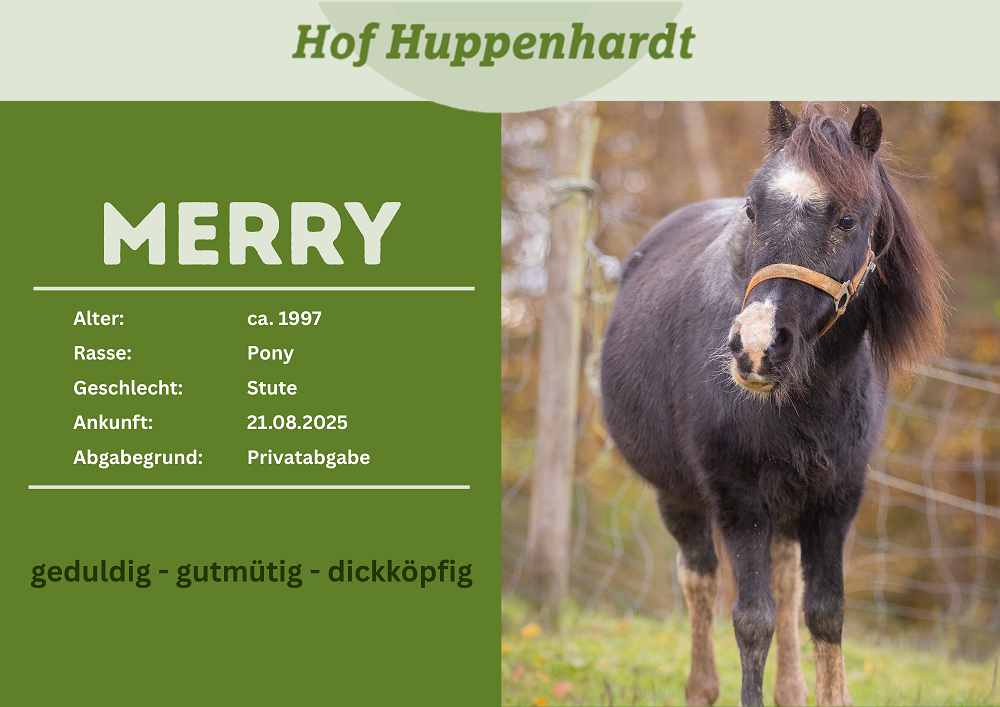 Die süße Merry kam zusammen mit ihrem Kumpel Kalimero über den Bliesheimer Gnadenhof zu uns. Die engagierten Tierschützenden des Gnadenhofes ereilte der dringende Hilferuf einer privaten Halterin, die erkrankt ist und sich deswegen nicht mehr um die zwei kümmern kann. Da der Gnadenhof selbst nicht die Möglichkeit hat, den besonderen Bedürfnissen von Kalimero gerecht zu werden, haben sie sich an uns gewandt. Merry ist eine süße, ruhige Stute, die etwas aufgepäppelt werden muss. Sie lässt sich problemlos führen und freut sich immer über Leckereien und Streicheleinheiten.Steckbrief