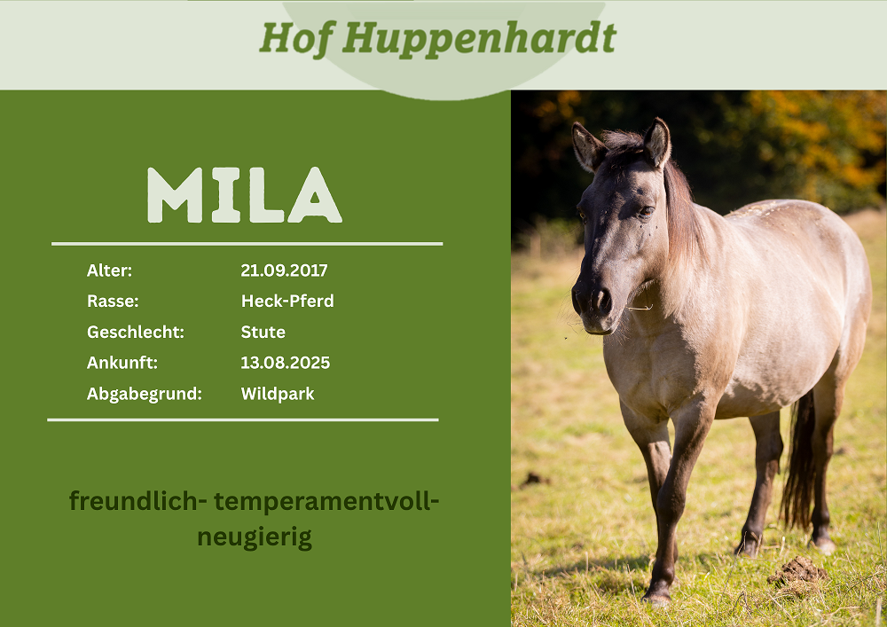 Die schöne Mila wurde von einem Wildpark bei uns abgegeben. Die Tarpan Stute wurde dort als Teil einer Wildpferdeherde zur Zucht gehalten. Nach einer Todgeburt und einem Fohlen, welches mit so starken Fehlbildungen zur Welt kam, dass es erlöst werden musste, entwickelte Mila eine Hufrehe. Daraufhin konnte die Stute nicht weiter zur Zucht eingesetzt werden und der Park suchte ein neues Zuhause für sie. Wir beschlossen Mila bei uns aufzunehmen, auch wenn wir anfangs unschlüssig waren, wie gut sie in der Handhabung sein würde. Eine unberechtigte Sorge, wie sich gezeigt hat. Mila lässt sich führen, aufhalftern und putzen. Jetzt suchen wir ein liebevolles Zuhause, indem die Stute einfach sie selbst sein kann.Steckbrief