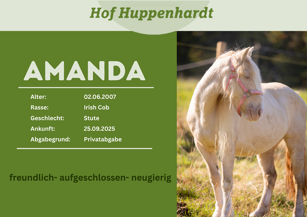 Die liebe Amanda kam Ende September zu uns auf den Hof. Ihre alte Besitzerin wandert aus und hatte leider keine Möglichkeit die Stute unterzubringen. Die hübsche Stute ist sehr zutraulich und hat sich bei uns schnell in der Herde eingefunden. Körperlich ist fit und theoretisch reitbar, allerdings fehlen ihr dazu aktuell die Muskeln. Jetzt ist erstmal Bodenarbeit angesagt.Steckbrief