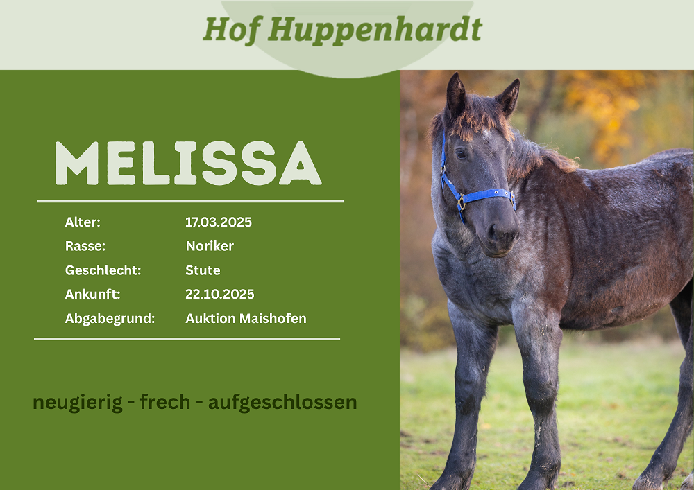 Melissa war das erste Fohlen, welches wir dieses Jahr auf der Auktion in Maishofen ersteigert haben. Überraschenderweise hatte, außer dem Schlachter, niemand auf die hübsche Blauschimmel Stute geboten. Also ergriffen wir die Chance. Bei uns zeigt Melissa sich als neugieriges und charakterstarkes Fohlen. Sie ist definitiv die Anführerin unserer kleinen Fohlengruppe und schreckt auch nicht vor Konfrontation mit den ausgewachsenen Stuten zurück. Zu uns Zweibeinern kommt sie immer als erstes und lässt sich liebend gerne kraulen.Steckbrief