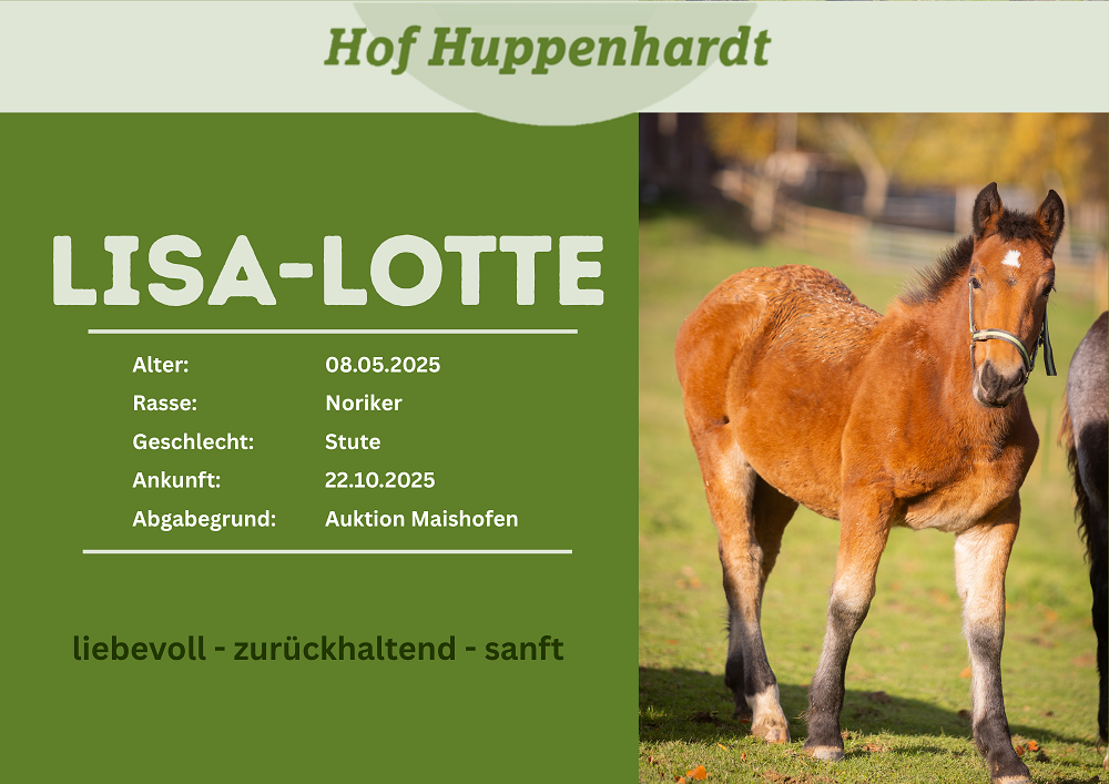 Das Küken in der Runde von Fohlen, die wir retten konnten, ist Lisa-Lotte oder nur Lotte, wie wir sie nennen. mit ihren gerade Mal fünf Monaten war Lotte eines der jüngsten Fohlen auf der Auktion und lief noch gemeinsam mit ihrer Mutter in der Halle. Die zwei wurden nach der Auktion getrennt und Lotte startete bei uns ihr neues Leben. Sie hängt sehr an Melissa und schaut sich viel bei ihr ab, zum Glück auch, dass wir Zweibeiner gar nicht so übel sind. Kraulen gefällt ihr auf jeden fall sehr gut. Wir suchen für die kleine Stute jetzt ein liebevolles Zuhause, indem sie erwachsen werden kann.Steckbrief