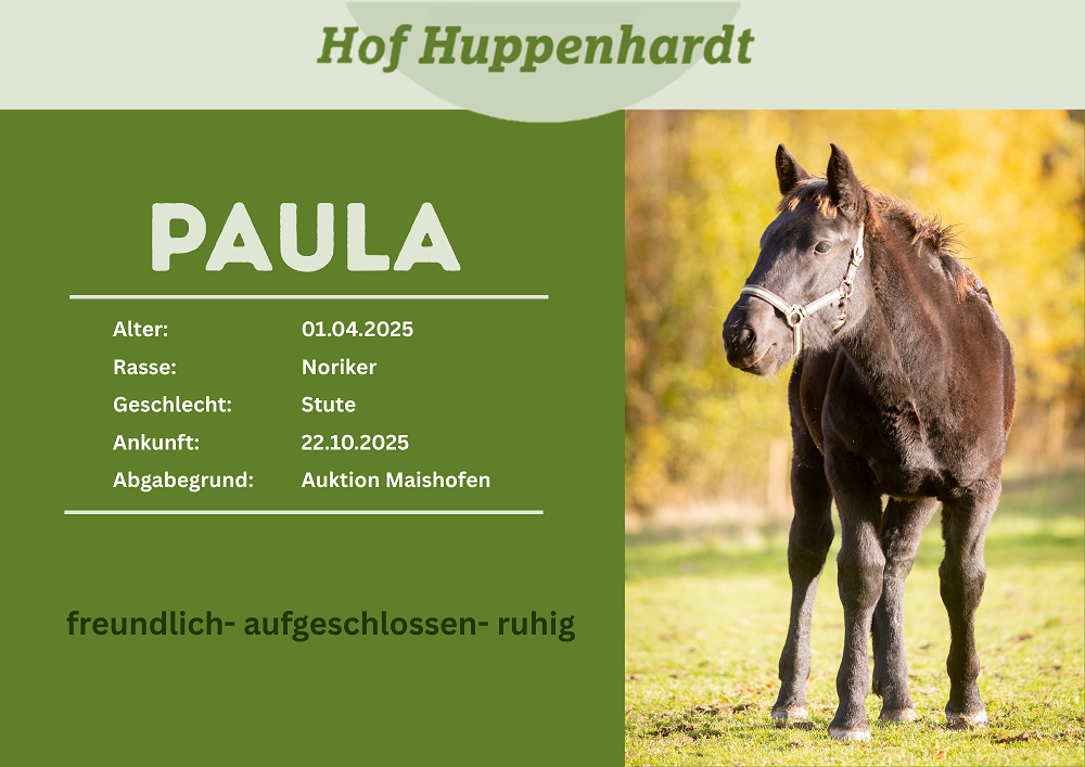 Paula ist leider ein typisches Exemplar für ein Noriker-Fohlen, dass zum Schlachter geht. Als Rappe gilt sie in der Zucht als unauffällig und auch bei der Auktion zeigten sich lediglich die Schlachter interessiert. Wir haben in Paula direkt etwas besonders gesehen und wollten ihr ein anderes Leben ermöglichen. Sie ist ein total ruhiges Fohlen und macht bisher alles ganz entspannt mit. Sowohl der Transport, als auch das Führen am Halfter machen ihr nichts aus. Wir hoffen, dass noch jemand da draußen Paulas gelassene Art schätzt und ein freies Plätzchen für sie hat.Steckbrief