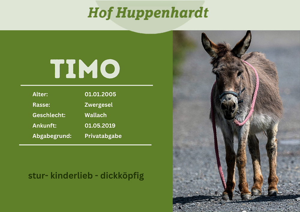 Timo kam zusammen mit Theo (mittlerweile vermittelt) im Mai 2019 auf unseren Hof. Aus privaten Gründen musste er abgegeben werden und leistetet seitdem dem kleinen Felix Gesellschaft. Aber auch mit den anderen Eseln kommt er sehr gut klar. Der süße Zwergesel ist lieb, aufgeweckt und immer für Streicheleinheiten zu haben. Timo ist eher ruhig und liebt die Aufmerksamkeit des Menschen. Bei Spaziergängen zeigt er sich auch unerschrocken. Außerdem liebt er es sich zu wälzen oder einfach entspannt in der Sonne zu liegen.Steckbrief