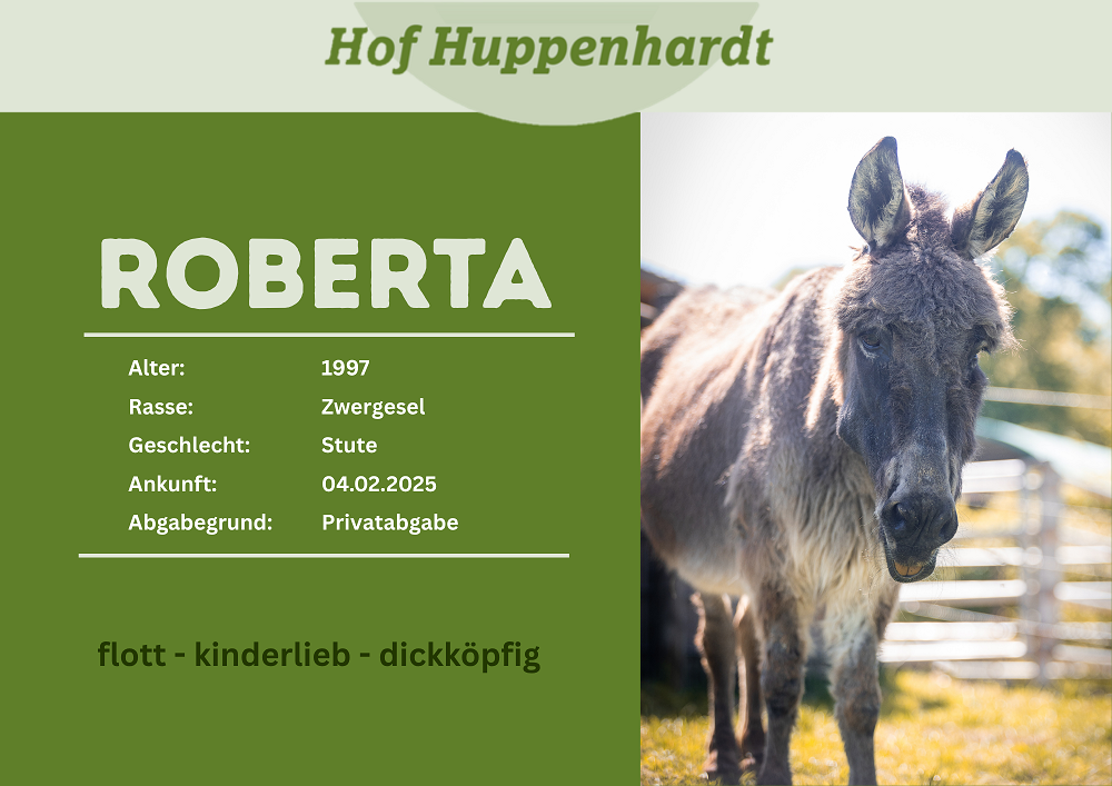 Roberta und ihr Freund Philip zogen bei uns ein, um Zwergesel Timo Gesellschaft zu leisten, nachdem dessen bester Freund Felix verstarb. Roberta und Philip wurden abgegeben, da ihre Vorbesitzer sich aus Altersgründen nicht mehr um die beiden kümmern konnten. Roberta und Philip gehören beide selbst schon zu den Senioren und haben es dringend nötig, ein wenig altersgerecht aufgepäppelt zu werden. Roberta hat aktuell eine Entzündung im Maul, um die wir uns nun kümmern werden. Auffällig ist auch ihr Hahnentritt – eine neurologische (aber nicht einschränkende) Erkrankung, die sie sich mit ihrem neuen Freund Timo teilt. Die Eseloma ist sehr ruhig, zutraulich, genügsam und entspannt.Steckbrief