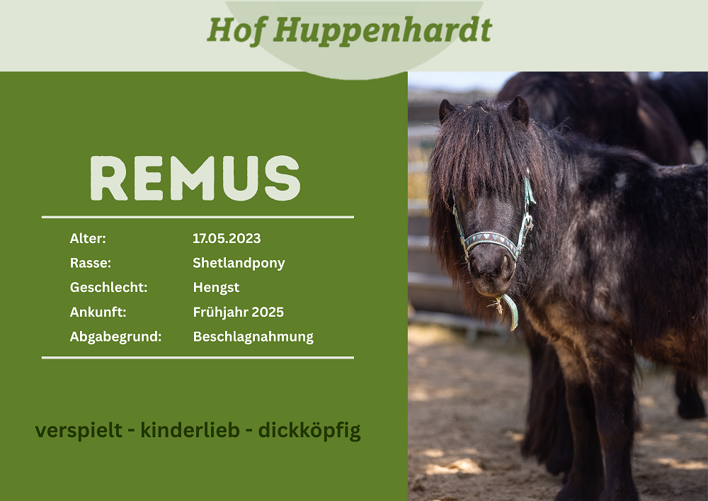 Remus kam zusammen mit Sirius als eine Beschlagnahmung des Veterinäramts auf den Hof. Lange Zeit war unklar, ob die zwei zu ihrem ursprünglichen Besitzer zurückkehren können. Mittlerweile ist jedoch klar, dass die Shetys auf dem Hof bleiben und ein neues Zuhause suchen. Remus ist ein aufgeweckter, kleiner Kerl. Er hat altersentsprechend viel Unsinn im Kopf und weiß genau, was er will. Ungeachtet seiner Körpergröße lässt er sich von niemandem einschüchtern, auch nicht von den Noriker-Hengsten mit denen er sich den Auslauf teilt.Steckbrief