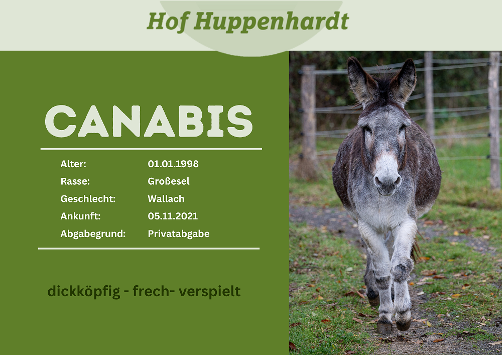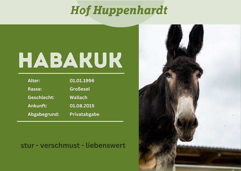 Habakuk kam aus der Eifel zu uns, da seine Vorbesitzer ihn nicht mehr halten konnten. Der hübsche Kerl ist ein sehr anhänglicher, liebenswerter und verschmuster Esel, der den Kontakt zum Menschen sehr genießt. Er mag es, gebürstet, gekrault und beschmust zu werden und tut auch lautstark kund, wenn er nicht genug Beachtung bekommt. Habakuk liebt den Kontakt zu Menschen und geht gerne spazieren – wenn auch in seinem eigenen Tempo – ganz Esel eben. Und wehe die Stalltür ist nicht richtig verschlossen, dann ergreift Habakuk gerne mal die Gunst der Stunde, um den Hof ordentlich aufzumischen.Steckbrief