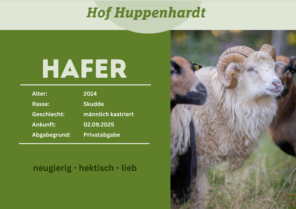 Hafer stammt ursprünglich aus einer vierköpfigen Herde. Seine Kumpels sind mit der Zeit leider alle altersbedingt verstorben und die Besitzer*innen wollten keine neuen Tiere mehr anschaffen. So blieb der kleine Schafsopa alleine zurück. Bei uns hat er ein paar Artgenossen, während wir ein nettes Zuhause für seinen Lebensabend suchen. Hafer ist ein lieber kleiner Kerl, der sich jeden Tag freut, wenn man ihn besuchen kommt.Steckbrief