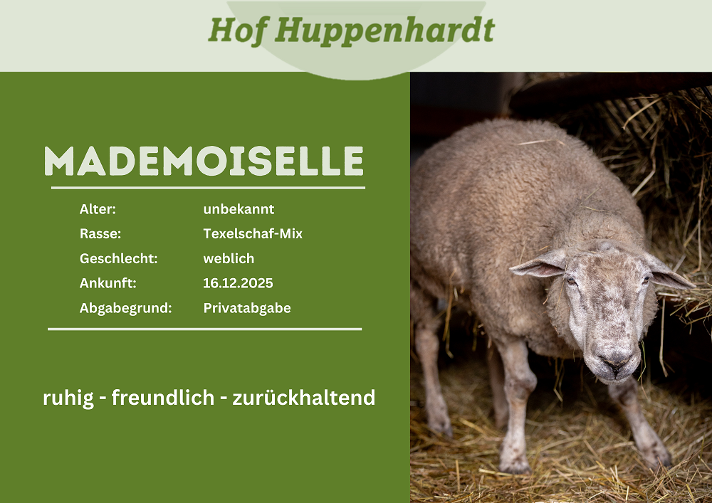 Mademoiselle kam zusammen mit acht anderen Schafen zu uns, die den Restbestands eines Hofes bildeten, der aufgelöst wurde. 19 von den insgesamt 30 Schafen fanden schnell ein neues Zuhause. Die restlichen neun sollten aufgrund ihres schlechten Gesundheitszustands eingeschläfert werden. Wir entschieden der Gruppe noch eine Chance zu geben und sie zur Palliativpflege bei uns aufzunehmen. Alle Schafe leiden an inzuchtbedingten Beinproblemen.