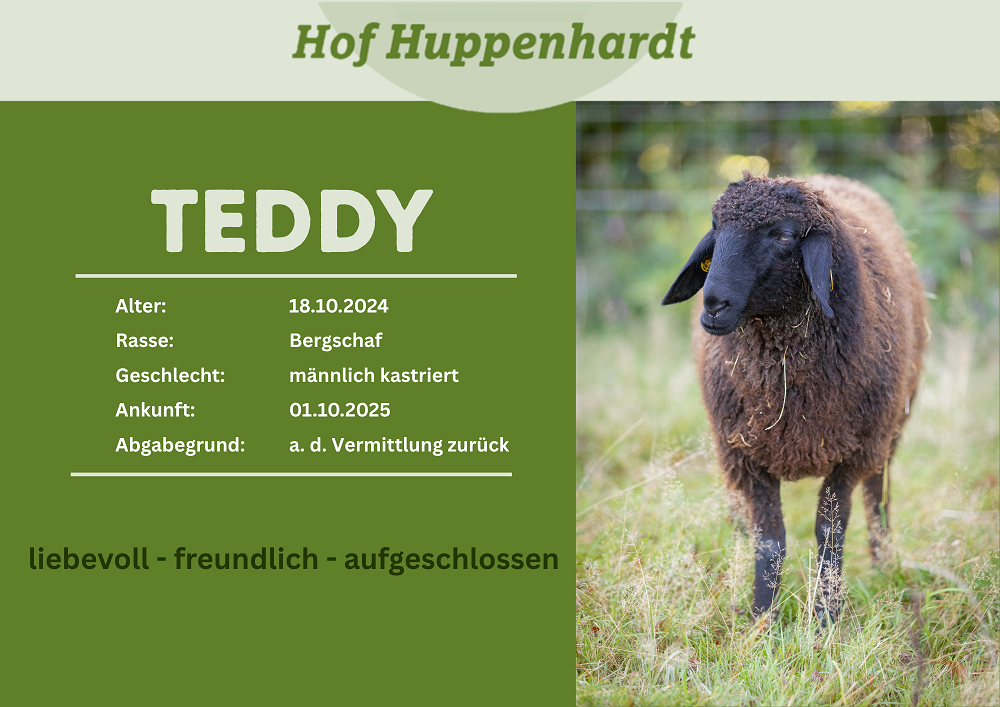 Teddy ist ein süßer Schafsbock, der immer auf einen zu rennt, wenn man die Weide betritt. Teddy sucht jetzt zusammen mit seinem Kumpel Odin nach einem neuen Zuhause, wo die zwei Jungs glücklich zusammen leben können. Streicheleinheiten und Leckerlis sind dabei ein Muss für ihn.Steckbrief