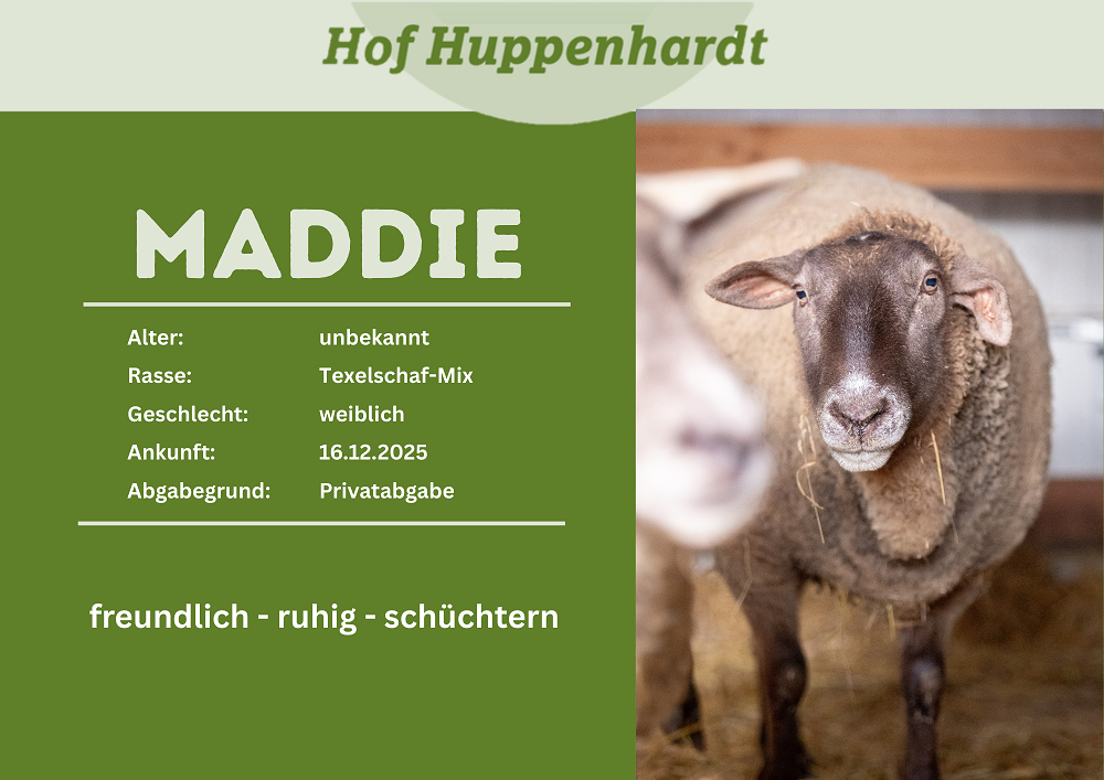 Maddie kam zusammen mit acht anderen Schafen zu uns, die den Restbestands eines Hofes bildeten, der aufgelöst wurde. 19 von den insgesamt 30 Schafen fanden schnell ein neues Zuhause. Die restlichen neun sollten aufgrund ihres schlechten Gesundheitszustands eingeschläfert werden. Wir entschieden der Gruppe noch eine Chance zu geben und sie zur Palliativpflege bei uns aufzunehmen. Alle Schafe leiden an inzuchtbedingten Beinproblemen.