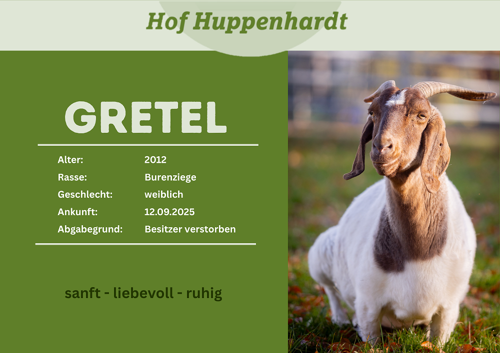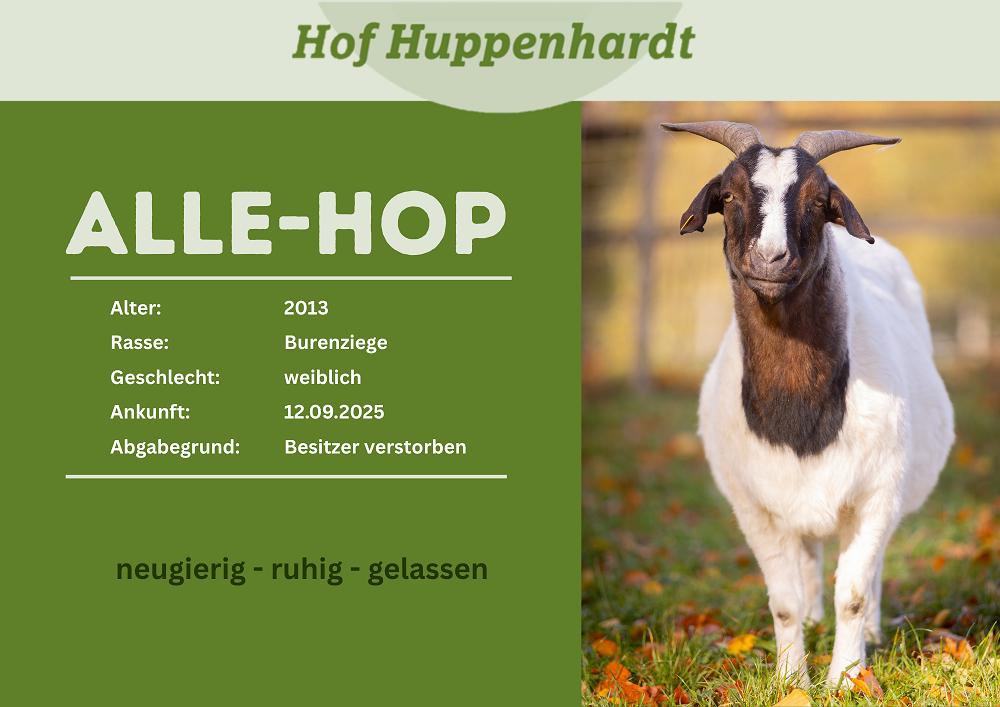 Alle-Hop kam zusammen mit ihrer Mutter Gretel auf den Hof. Ursprünglich lebten Mutter und Tochter zusammen mit einem Bock zusammen. Leider verstarb die Besitzerin der drei Ziegen und Bekannte konnten sich nur übergangsweise kümmern. Der Bock wurde wegen eines schlimmen Falls von Arthrose eingeschläfert. Auch Gretel leidet unter der gleichen Krankheit und lässt sich deshalb häufig auf ihre vorderen Knie herunter. Alle-Hop hingegen ist ihrem Alter entsprechend fit und hat sich sofort gut in der neuen Herde eingefunden. Menschengegenüber zeigt sie sich sehr zutraulich und freundlich.Steckbrief