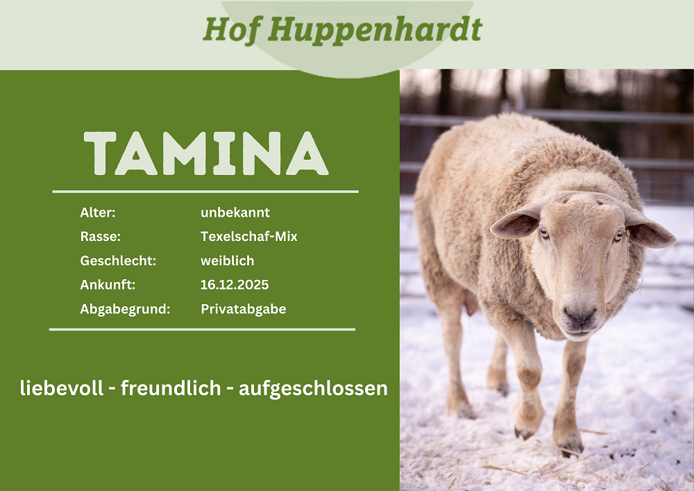 Tamina kam zusammen mit acht anderen Schafen zu uns, die den Restbestands eines Hofes bildeten, der aufgelöst wurde. 19 von den insgesamt 30 Schafen fanden schnell ein neues Zuhause. Die restlichen neun sollten aufgrund ihres schlechten Gesundheitszustands eingeschläfert werden. Wir entschieden der Gruppe noch eine Chance zu geben und sie zur Palliativpflege bei uns aufzunehmen. Alle Schafe leiden an inzuchtbedingten Beinproblemen. Tamina leidet zudem unter einer chronischen Euterentzündung.