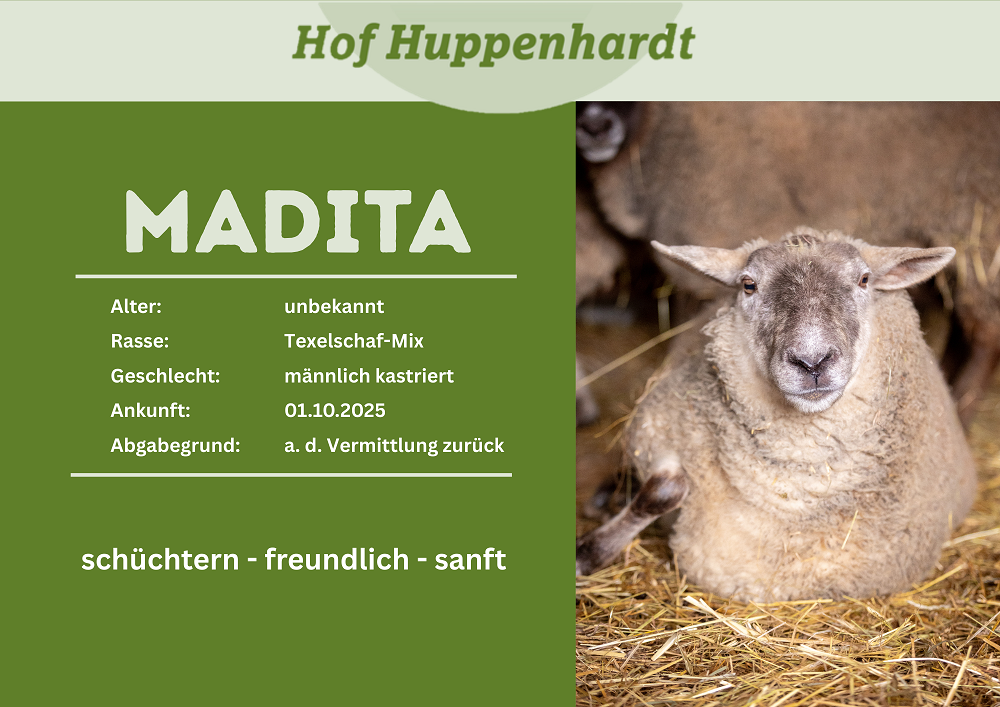 Madita kam zusammen mit acht anderen Schafen zu uns, die den Restbestands eines Hofes bildeten, der aufgelöst wurde. 19 von den insgesamt 30 Schafen fanden schnell ein neues Zuhause. Die restlichen neun sollten aufgrund ihres schlechten Gesundheitszustands eingeschläfert werden. Wir entschieden der Gruppe noch eine Chance zu geben und sie zur Palliativpflege bei uns aufzunehmen. Alle Schafe leiden an inzuchtbedingten Beinproblemen.