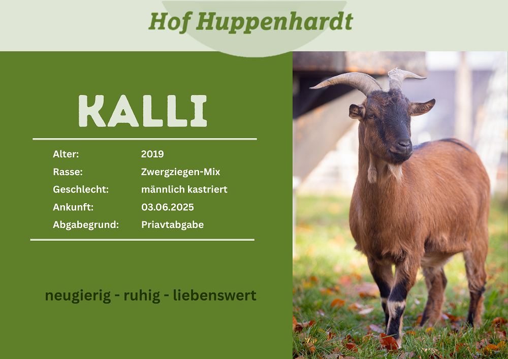 Kalli kam Anfang Juni zusammen mit seiner Schwester Kristel zu uns auf den Hof. Wegen eines Wurmbefalls mussten die zwei erstmal eine Weile bei uns in Quarantäne verbringen. Jetzt sind sie wieder fit und toben auf unserer Ziegenweide herum. Kristel und Kalli haben vorher zusammen bei Privatleuten gelebt. Leider haben sie sich nicht mit der Schafsherde verstanden und suchen deswegen nach einem neuen Zuhause. Mit anderen Ziegen haben sie kein Problem und auch Menschen gegenüber sind beide freundlich, wenn auch anfangs etwas zurückhaltend.Steckbrief