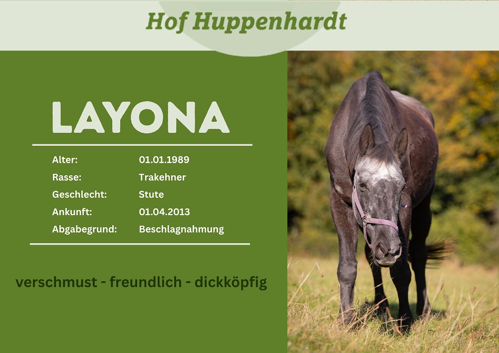 Layona ist schwer einzuschätzen, da sie sich auf der Weide mit ihren Artgenossen gänzlich anders zeigt als gegenüber Menschen. In ihrer Herde präsentiert sie sich unterwürfig, ist die rangniedrigste und steht meist abseits. Menschen gegenüber verhält sie sich mittlerweile grundsätzlich freundlich, wenn auch schon mal ein wenig ungeduldig. Es zeigte sich, dass hinter dem zuvor so unberechenbar scheinenden Pferd eine riesengroße Schmusebacke steckt! Layona stammt aus einer Beschlagnahmung durch das Veterinäramt. Die Pferde standen in Schlamm und Scherben, hatten aufgrund starken Milbenbefalls kaum noch Fell und waren bis auf die Knochen abgemagert. Heute ist davon gottseidank nichts mehr zu sehen, so dass man der süßen Omi ihr Alter gar nicht ansieht.Steckbrief