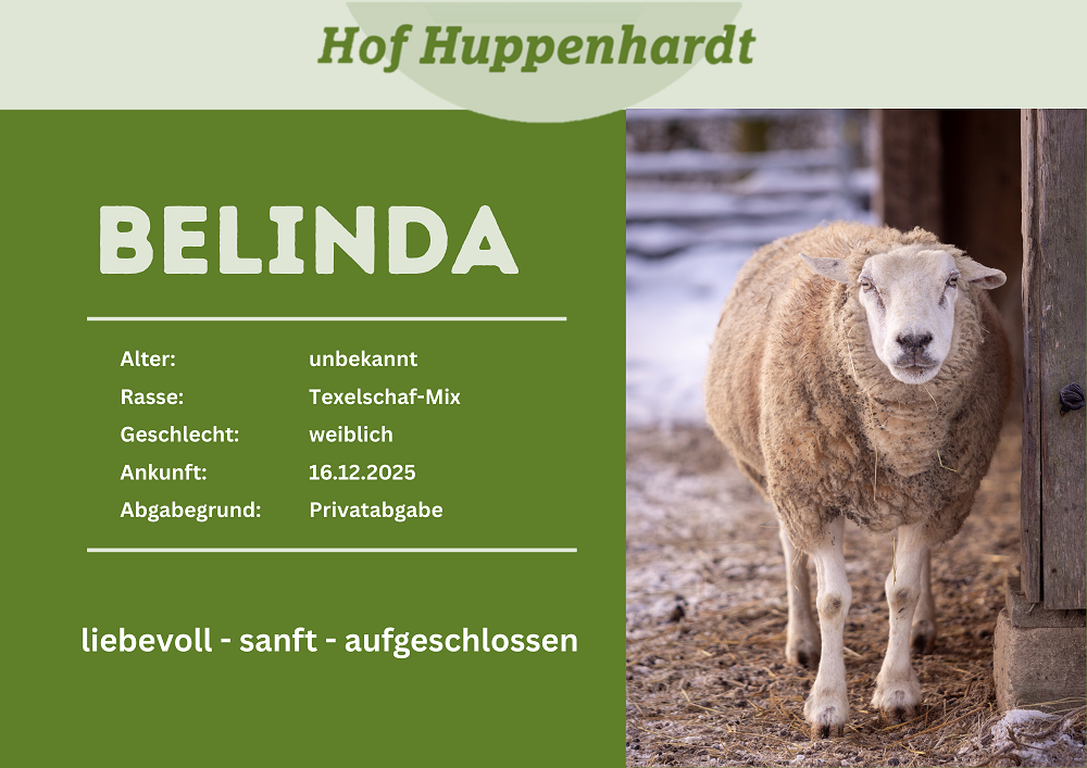 Belinda kam zusammen mit acht anderen Schafen zu uns, die den Restbestands eines Hofes bildeten, der aufgelöst wurde. 19 von den insgesamt 30 Schafen fanden schnell ein neues Zuhause. Die restlichen neun sollten aufgrund ihres schlechten Gesundheitszustands eingeschläfert werden. Wir entschieden der Gruppe noch eine Chance zu geben und sie zur Palliativpflege bei uns aufzunehmen. Alle Schafe leiden an inzuchtbedingten Beinproblemen.