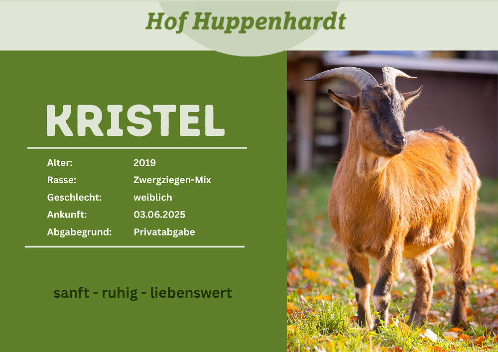 Kristel kam Anfang Juni zusammen mit ihrem Bruder Kalli zu uns auf den Hof. Wegen eines Wurmbefalls mussten die zwei erstmal eine Weile bei uns in Quarantäne verbringen. Jetzt sind sie wieder fit und toben auf unserer Ziegenweide herum. Kristel und Kalli haben vorher zusammen bei Privatleuten gelebt. Leider haben sie sich nicht mit der Schafsherde verstanden und suchen deswegen nach einem neuen Zuhause. Mit anderen Ziegen haben sie kein Problem und auch Menschen gegenüber sind beide freundlich, wenn auch anfangs etwas zurückhaltend.Steckbrief