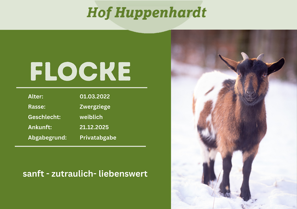 Flocke stieß kurz vor Weihnachten zu uns. Ihre Partnertiere sind verstorben und ihre Besitzerin wollte die Ziegenhaltung aufgeben. Damit Flocke nicht allein bleiben muss, kam sie zu uns und sucht jetzt ein Für-Immer-Zuhause.