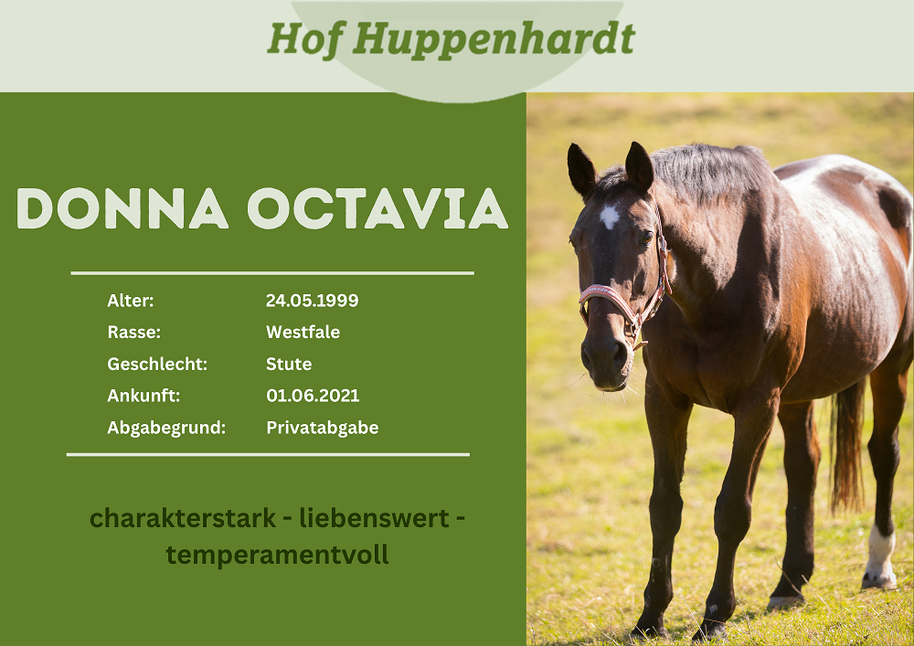 Die Westfalen-Stute Donna Octavia wurde schweren Herzens bei uns abgegeben, da sich die Lebensumstände ihrer ehemaligen Besitzerin änderten und ihr Gesundheitszustand die Pferdehaltung nicht mehr zuließ. Grundsätzlich ist Donna ein freundliches und verschmustes Pferd, jedoch mit stark ausgeprägtem Eigensinn. In ihrer Welt hat man nach ihrer Pfeife zu tanzen, sonst kann es schnell sehr ungemütlich werden. Auch gesundheitlich bringt Donna einige Baustellen mit, die ihr aber unter optimalen Haltungsbedingungen wenig Probleme bereiten. Da sie an einer leichten Heustauballergie leidet, wäre für sie eine geräumige, gut belüftete Box und täglicher Weidegang in einer Stutenherde ideal. Auf Veränderungen im Tagesablauf oder ständig wechselnde Herdenmitglieder reagiert sie sehr sensibel und zeigt dies nicht nur mit Unruhe, sondern auch mit Schlafmangel. Aufgrund von Kissing Spines ist Donna nicht mehr reitbar, jedoch ist sie für Bodenarbeit zu begeistern. Auch jegliche Art von Zuwendung, wie z.B. das Putzen, genießt sie in vollen Zügen. Tierärztliche Untersuchungen sowie Hufschmiedbesuche klappen in der Regel gut. Donna Octavia ist ein durchaus liebenswertes Pferd mit Charakter. Um ihr ein neues Zuhause schenken zu können, sind allerdings Menschen gefragt, die sich gerne neuen Herausforderungen stellen sowie Pferderfahrung und die optimalen Bedingungen für ihre Unterbringung haben. Ein längeres Kennenlernen ist auf jeden Fall notwendig.Steckbrief
