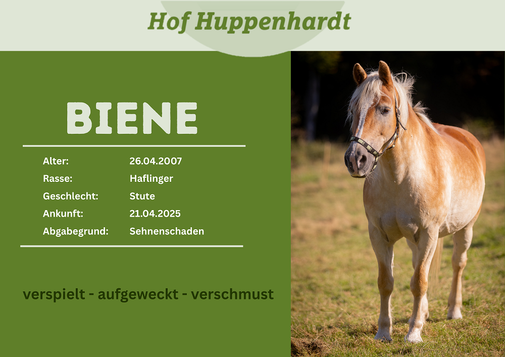 Die schöne Haflingerstute Biene wurde von einem Reitsportverein bei uns abgegeben. Sie hat einen schweren Sehnenschaden, weshalb sie bereits seit vier Monaten in der Box stehen muss. Hier bei uns kann sie sich erstmal richtig auskurieren und danach werden wir schauen, wie es mit Biene weitergeht. Bisher zeigt sie sich sehr freundlich gegenüber anderen Tieren und Menschen. Sie ist total verschmust und freut sich über jeden, der sie in ihrer Box besuchen kommt.Steckbrief