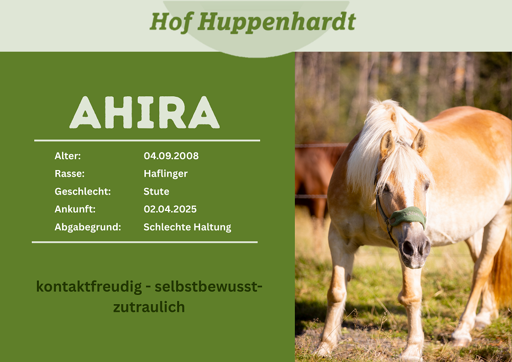 Ahira kam Anfang April 2025 aus schlechter Privathaltung zu uns. Die süße Haflinger-Stute ist fit und geht liebevoll mit anderen Zwei- und Vierbeinern um. Sie freut sich über Beschäftigung jeder Art, sei es Bodenarbeit oder gemeinsame Spaziergänge im Wald – Ahira ist dabei.Steckbrief