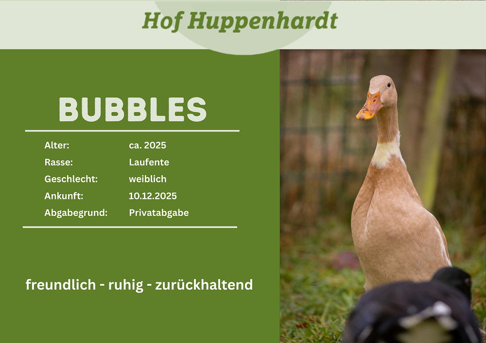 Bubbles kam zusammen mit Snowflake, Sugar, Peach und Starlight zu uns auf den Hof. Seitdem versuchte sie sich mit unserer Laufenten-WG anzufreunden. Die alten Herren sind allerdings etwas skeptisch, doch Bubbles gibt nicht auf.