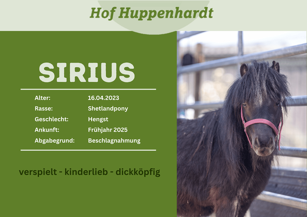 Sirius kam zusammen mit Remus als eine Beschlagnahmung des Veterinäramts auf den Hof. Lange Zeit war unklar, ob die zwei zu ihrem ursprünglichen Besitzer zurückkehren können. Mittlerweile ist jedoch klar, dass die zwei auf dem Hof bleiben und ein neues Zuhause suchen. Sirius ist ein ruhiger, kleiner Kerl. Er schmuste gerne und hat altersentsprechend viel Unsinn im Kopf. Besonders mit Leckereien lässt er sich schnell überzeugen.Steckbrief