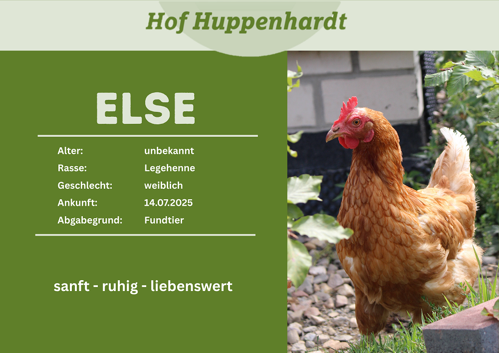 Else ist ein waschechtes Fundhuhn. Sie wurde von aufmerksamen Leuten auf der Straße eingesammelt und zu uns gebracht. Leider vermisst sie niemand.