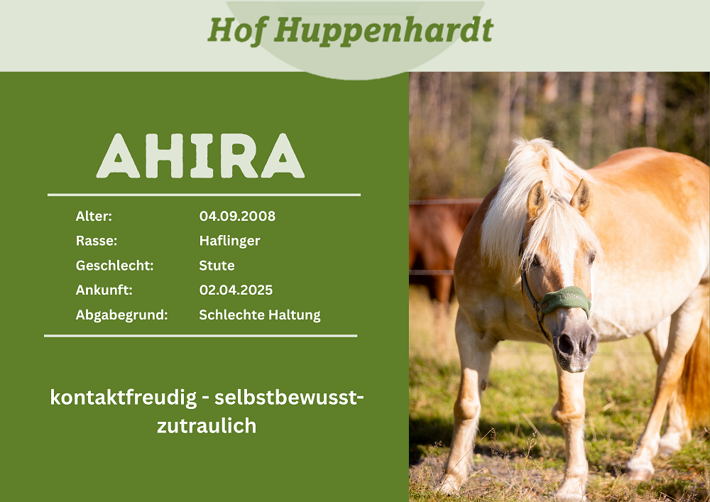 Ahira kam Anfang April 2025 aus schlechter Privathaltung zu uns. Die süße Haflinger-Stute ist fit und munter. Sie freut sich über Beschäftigung jeder Art, sei es Bodenarbeit oder gemeinsame Spaziergänge im Wald – Ahira ist dabei.