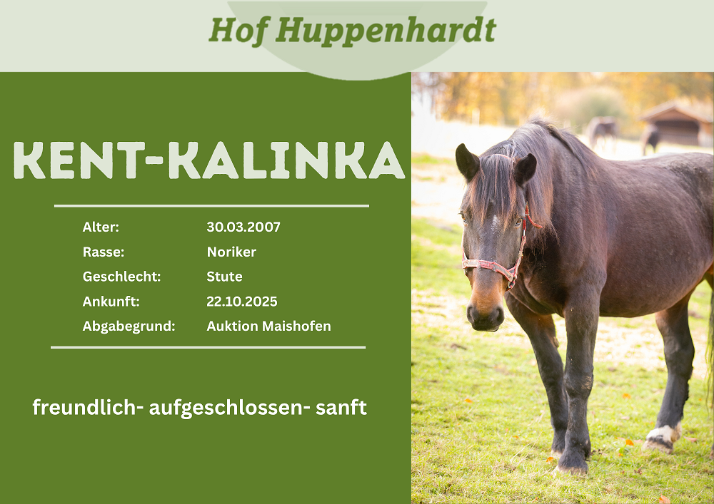Kalinka, eigentlich Kent-Kalinka, ist eine ehemalige Zuchtstute, die diesen Herbst in Maishofen versteigert werden sollte. Mit ihren, in unseren Augen noch jungen, 18 Jahren war sie als Zuchtstute ausrangiert und das älteste Pferd auf der Auktion. Außer uns bot nur der Schlachter auf die Stute. Zu Glück könnten wir den Zuschlag sicher und Kalinka so eine zweite Chance geben. Wir haben eine chronische Rehe bei ihr festgestellt, allerdings weißt sie bisher keine Schübe oder ähnliches auf und geht bei uns auch normal mit auf die Weide. Menschen gegenüber ist sie total verschmust und anhänglich. Wir würden uns sehr freuen, wenn Kalinka noch ein liebevolles Zuhause findet, indem sie einfach Pferd sein darf.Kalinka